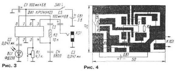 Большинство деталей размещено на печатной плате из односторонне фольгированного стеклотекстолита, эскиз которой показан на рис. 4. Монтаж ведут так же, как описано выше. Плату надо разместить в корпусе подходящих размеров, а для фотодиода сделать отверстие.