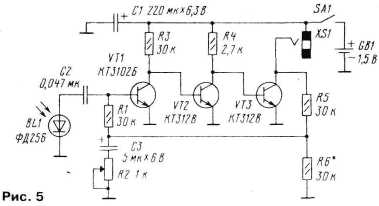 При отсутствии микросхемы приемник можно собрать на транзисторах по схеме, приведенной на рис. 5. Его основа – трех каскадный УЗЧ, выполненный по схеме с непосредственной связью между каскадами. Благодаря ООС по постоянному току через цепь R1R5R6 режим транзисторов устанавливается автоматически. Громкость регулируется резистором R2 за счет изменения глубины ООС по переменному напряжению звуковых частот. К приемнику можно подключать головные телефоны с суммарным сопротивлением постоянному току не менее 100 Ом.