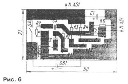 Большинство деталей размещают на печатной плате из одностороннего фольгированного стеклотекстолита, эскиз которой показан на рис. 6. Монтаж ведут описанным выше способом. Налаживание приемника сводится к установке (с помощью подбора резистора R6) напряжения на коллекторе транзистора VT3 около 0,8...1 В.