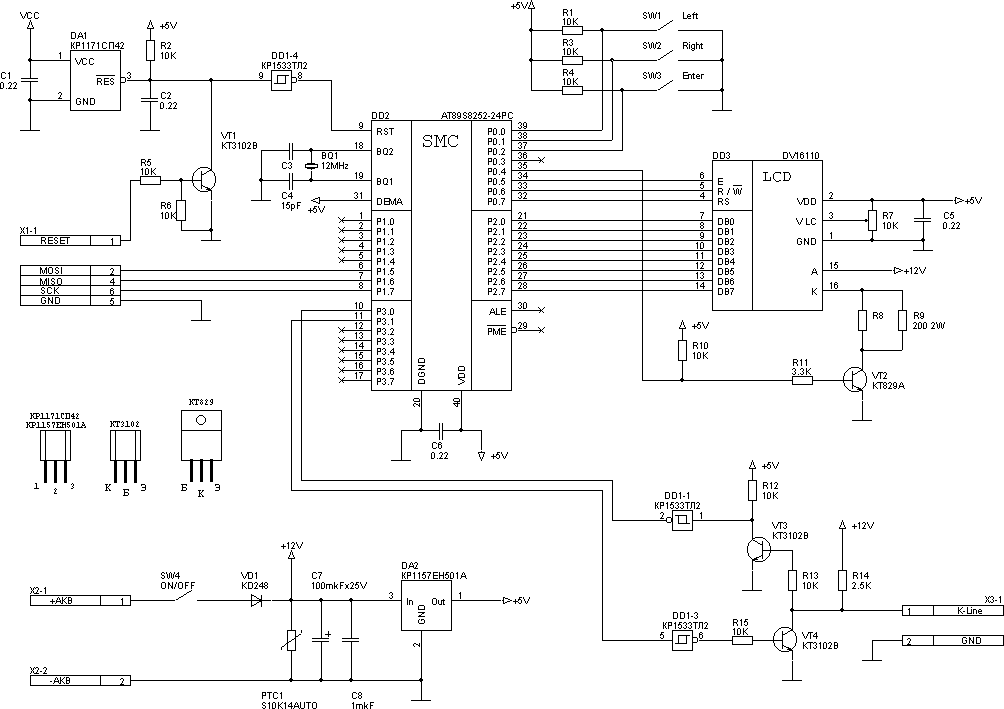После включения зажигания контроллер Bosch M1.5.4 пытается установить связь с иммобилайзером. Если Ваш автомобиль не оборудован имобилайзером, то сигналы к иммобилайзеру попадут на вход «Индикатора М1.5.4». Если в момент установки связи контроллера двигателя с иммобилайзером «Индикатор М1.5.4» подключен к диагности-ческой линии и работает на передачу, то двигатель может заглохнуть. Для исключения этой ситуации «Индикатор М1.5.4» после включения делает паузу 3 секунды до первой попытки подключиться к контроллеру двигателя. К автомобилям, оборудованным иммобилайзером, все вышесказанное не относится. В файле prog.zip находятся исходники модулей управляющей программы на языках ASSM и C для компилятора FSI.
