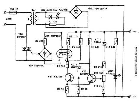 Преимуществом устройства является возможность автоматического отключения его от сети и подключения к ней за счет энергии аккумуляторных батарей. При соответствующей замене элементов автомат можно использовать для подзарядки аккумуляторов резервного питания АТС и др. объектов. Силовой трансформатор в автомате использован стандартный, типа ТПП-318У, обеспечивающий на выходе вторичной обмотки напряжение не менее 16 В (ток нагрузки не менее 10А). Транзисторы VT1, VT2 можно заменить на КТ603. Симистор VD1 необходимо установить на теплоотвод с площадью не менее 100 кв.см.