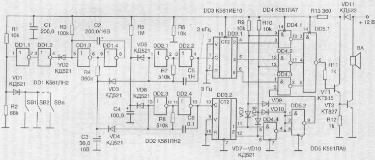 При замыкании контактов дверных датчиков SB1—SBn через элементы DD1.1, DD1.2 и диод VD2 нулевой потенциал поступает на вход одновибрато-ра на элементах DD1.3 и DD1.4. В результате на выводе 6 элемента DD1.3 одновибратора появляется лог. "1", которая через цепь задержки R4, СЗ поступает на катоды диодов VD3 и VD4. Диоды закрываются. При этом напряжение низкого уровня на выводах 1 и 13 элементов DD2.1 и DD2.3 разрешает работу задающего (DD2.1 и DD2.2) и тактового генераторов (DD2.3 и DD2.4). Цепь R4, СЗ формирует задержку длительностью 5 с, которая дается владельцу автомобиля дли отключения сигнализации потайным тумблером. В противном случае схема переходит в режим тревоги. Время звучания сигнала тревоги зависит от номиналов элементов цепи R3, С2. Спустя,20 с схема переходит в режим охраны.