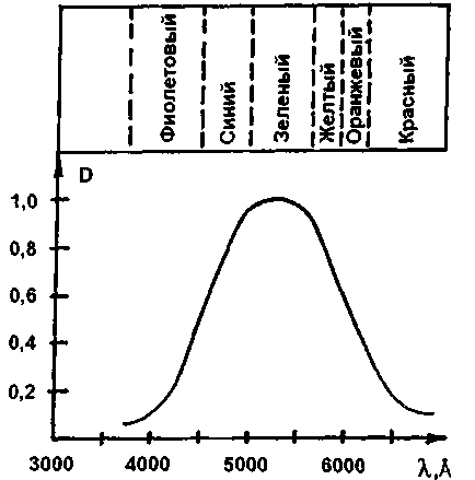 Электрический противоослепляющий фонарь устанавливается на уровне основного поля зрения водителя, с левой стороны лобового стекла, что практически не мешает водителю при движении. Свет от фонаря распространяется параллельно лобовому стеклу и не попадает в глаз водителя, для этого у фонаря имеется светозащитный козырек. При включении фонаря происходит поглощение значительной части лучистого потока света фар, уменьшая засветку сетчатки глаза. Кроме того, использование в фонаре синего или зеленого светофильтра дает возможность контролировать обстановку на дороге, поскольку в ночное время глаза человека наиболее чувствительны к синим и зеленым лучам (рис.2) видимого спектра [1].