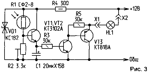 На рис.3 приведена принципиальная схема автоматического устройства включения и выключения противоослепляющего фонаря. Оно состоит из порогового усилителя светового потока на транзисторе VT1, составного транзисторного ключа на транзисторах разной проводимости VT2, VT3 и схемы задержки выключения лампы HL1, выполненной на резисторе R3 и накопительном конденсаторе С1. Устройство питается от параметрического стабилизатора на стабилитроне VD1 и резисторе R4. Устройство включается совместно с фарами автомобиля. Как только лучи света фар встречного транспорта попадают на фоторезистор R1, открывается транзистор VT1, который включает транзисторный ключ VT2, VT3, и на лампу фонаря HL1 поступает бортовое напряжение +12 В - лампа начинает светить. В это время одновременно происходит заряд конденсатора С1. Когда освещение фоторезистора прекращается, транзистор VT1 закрывается, но лампа HL1 продолжает светить до полного разряда накопительного конденсатора С1 через резистор R3 и базо-эмиттерный переход транзистора VT2. Подстроечным резистором R2 устанавливают порог включения лампы фонаря HL1.