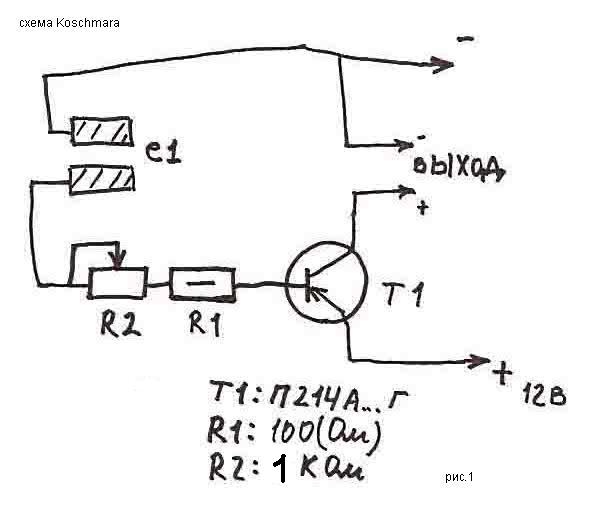Привиденный на рисунке 1 датчик дождя работает следующим образом: при попадании капли дождя между пластинами Е1 тем самым соединяя их. Через пластины и резисторы R1 и R2 поступает отрицательный потенциал на базу транзистора T1, тем самым открывая его. Через переходы эмитер-коллектор протекает положительный потенциал, а значит срабатывает устройство (эл. двигатель дворников).