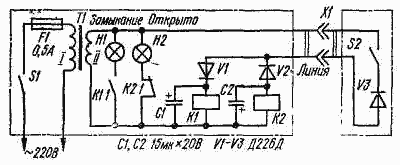 В косяк двери последовательно с диодом V3 устанавливают концевой выключатель S2. В исходном положении дверь закрыта, контакты выключателя S2 замкнуты, обмотка реле К2 питается током, выпрямленным диодами V2 и V3. Обмотка реле К1 обесточена из-за встречного включения диодов VI и V3. Обрыв проводов или размыкание контактов выключателя S2 приводит к обесточиванию обмотки реле К2. Индикаторами состояния двери и линии служат лампы накаливания H1, и Н2, включаемые контактами K1.l и K2.1 соответствующих реле.