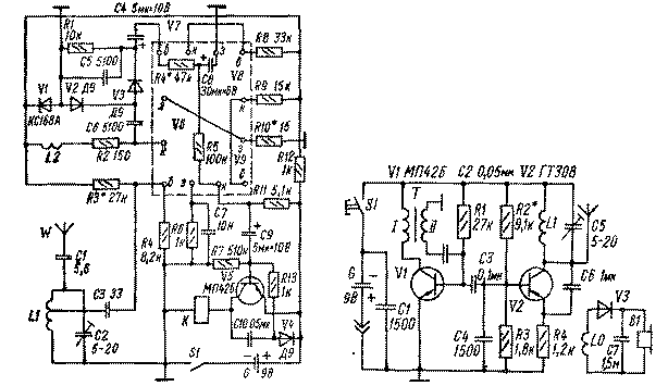На транспортных средствах, предназначенных для перевозки ценных грузов, могут быть применены радиосигнализаторы с дальностью действия до нескольких сотен метров. Для установки такого радиосигнализатора в автомобиле необходимо получить разрешение. Такой радиосигнализатор состоит из УКВ передатчика, включаемого с помощью одного либо нескольких микротумблеров В1, и приемника прямого усиления. Передатчик и приемник настроены на частоту 27...28 МГц. Миниатюрный радиопередатчик со штыревой антенной в виде отрезка провода устанавливается у переднего стекла в кабине автомобиля. Штыревая антенна радиоприемника должна быть сориентирована на антенну радиопередатчика и расстояние между этими антеннами не должно превышать 20...30 м. На рисунке изображены схемы приемной и передающей частей радиосторожа.