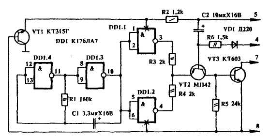 Указанные на схеме элементы можно заменить на аналогичные, со сходными параметрами. Так, например, на месте VT1 может устанавливаться транзистор КТ312, на месте VT2 ≈ любой из МП39 ≈ МП42, VT3 ≈ КТ608, КТ503, КТ815. Микросхему К176ЛА7 можно заменить на К561ЛА7 или К176ЛЕ5.