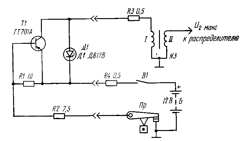 Мощный транзистор Т1 работает в ключевом режиме с нагрузкой в цепи коллектора, в качестве которой служит первичная обмотка I катушки зажигания КЗ. При включенном замке зажигания В1 и разомкнутых контактах прерывателя Пр транзистор Т1 закрыт, так как ток в цепи базы равен нулю.