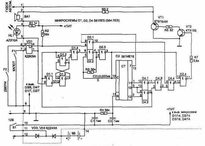 Рис. 1. Подключение системы охраны к автомобилю При охране автомобиля устройство работает с двумя типами внешних датчиков: а) для дверей (датчики открывания дверей или датчик механических колебаний, см. статью "Датчики для охранной сигнализации") — включает звуковой сигнал с задержкой 6 секунд; б) для закрытого капота и багажника — мгновенное включение звукового сигнала. Владелец автосторожа при срабатывании сигнализации по звуку легко может определить группу датчиков, сработавших во время охраны. Схема автосторожа обеспечивает после включения охраны задержку 12±2 секунд для выхода из машины и 6±1 секунд при входе в автомобиль для отключения сигнализации скрытно установленным тумблером S1 до срабатывания звукового сигнала.