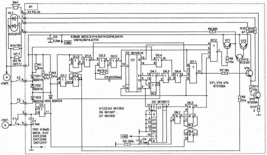 Рис. 2. Подключение системы охраны в квартире Схема подключения автосторожа (см. рис. 1) обеспечивает блокировку системы зажигания (второй парой контактов тумблера S1) на все время охраны вне зависимости от срабатывания датчиков. В охранном устройстве предусмотрена светодиодная индикация режима срабатывания датчиков сигнализации, что удобно при установке и эксплуатации, так как является индикатором нормальной работы всей схемы. Устройство питается от аккумулятора автомобиля, но в случае аварийной ситуации (при его отключении) схема автоматически переключается на встроенный резервный источник питания, при этом потребляемый ток в режиме ОХРАНА не превышает 0,5 мА. При охране квартиры или гаража электропитание устройства осуществляется от встроенного источника питания, которым является блок из шести элементов А316 или аккумуляторов НКГЦ-0,45, при этом ток потребления в режиме ОХРАНА не превышает 0,5 мА и элементы питания обеспечат работу устройства в режиме ОХРАНА не менее одного года (если не срабатывал звуковой сигнал). Работает устройство с двумя линиями от датчиков: а) датчик двери — включает звуковой сигнал с задержкой 6 секунд; б) датчик закрытого окна или вторых дверей — включение звукового сигнала мгновенно. Схема сторожа обеспечивает после включения режима охраны за держку в 12 секунд для выхода из квартиры и 6 секунд при входе — для отключения сигнализации до срабатывания звукового сигнала. В схеме сигнализации имеется светодиодная индикация режима срабатывания датчиков, что является показателем работы. Электрическая схема (рис. 3.3) собрана на четырех микросхемах КМОП серии, что обеспечивает малое потребление тока, и состоит из триггера на элементах D1.1...D1.3, генератора на частоту около 500 Гц — D2.2 и D2.3, счетчика тактовой частоты D3 и схемы селекции временных интервалов на микросхеме D4. Транзисторы VT1 и VT2 позволяют усилить ток в нагрузке, которой является внутренний малогабаритный динамик (ЗГДШ-14-4), а также может подключаться внешний источник сигнала — гудок автомобиля. В момент включения питания схемы на выходах счетчика D3 устанавливается (цепью СЗ, R4) лог. "0". Это обеспечивает появление лог. "1" на выводе D4/10 и лог. "0" на D1/3. При этом будет работать автогенератор и связанный с ним счетчик до момента времени, пока на выводе D3/2 не появится "1". Если ни один из датчиков не сработал, то через 12 секунд появится лог. "1" на выводе D1/3 — генератор остановится. С этого момента устройство будет находиться в режиме ОХРАНА, и срабатывание датчиков приведет к переключению триггера на элементах D1.1...D1.3 (на выводе D1/4 появится лог. "1", а на выводе D1/3 — "0"), что приведет к продолжению работы генератора и счетчика, а на выходной нагрузке через 6 секунд появится звуковой сигнал. Рис. 3.3 Применяемые резисторы и конденсаторы можно использовать любого типа. Все элементы схемы, кроме светодиода HL1, тумблера S1, динамика ВА1, резистора R5, элементов питания и датчиков, размещены на односторонней печатной плате размером 110х45 мм (рис. 3.4). При этом потребуется сделать шесть объемных перемычек (если использовать двухстороннюю печатную плату, то эти перемычки удобно выполнить печатными проводниками). Транзистор VT1 крепится к теплорассеивающей пластине (радиатору). В качестве переключателя S1 применен тумблер ТЗ или любой аналогичный с двумя переключающими контакта