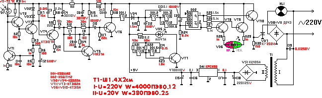 Блок питания собран по классической схеме на КРЕН9Б и выходное напряжение равно 9В. Он включает в себя DA1, C15-C18, VS1, T1. Конденсатор С19 служит для защиты устройства от скачков напряжения в электросети.Нагрузка на схеме показана лампой накаливания.