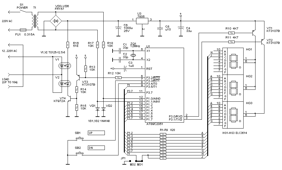 Основой регулятора мощности (см. рис. 2) является микроконтроллер U1 типа AT89C2051 фирмы ATMEL. Для питания схемы регулятора использован маломощный трансформатор T1, что вместе с применением оптотиристоров обеспечивает гальваническую развязку от сети. Это делает устройство более электробезопасным. Еще одним полезным свойством регулятора является то, что он может быть использован с нагрузками, рассчитанными на разное рабочее напряжение. Для этого достаточно подать на вход тиристоров требуемое напряжение с дополнительного трансформатора. Например, регулятор можно использовать для питания низковольтного паяльника. Необходимо только, чтобы напряжение и ток не превышали максимально допустимых для примененных тиристоров. Регулировка мощности в нагрузке осуществляется с помощью кнопок SB1 и SB2. Короткое нажатие одной из кнопок вызывает изменение мощности на один шаг. При удержании кнопки происходит монотонное изменение мощности. Одновременное нажатие двух кнопок выключает нагрузку, если до этого она была включена или включает максимальную мощность, если нагрузка была выключена. Для индикации мощности в нагрузке служат светодиодные семисегментные индикаторы HG1 - HG3. Для уменьшения количества элементов использована динамическая индикация, которая реализована программно. Встроенный в микроконтроллер аналоговый компаратор осуществляет привязку к сетевому напряжению. На его входы через ограничители R17, R18, VD1, VD2 поступает переменное напряжение с вторичной обмотки трансформатора питания. Роль ограничителя для отрицательной полярности выполняют диоды выпрямительного моста. Компаратор восстанавливает знак сетевого напряжения. Переключения компаратора происходят в моменты перехода сетевого напряжения через ноль. Выход компаратора опрашивается программно, и как только обнаруживается изменение его состояния, на выход управления тиристорами (порт микроконтроллера INT0) выдается управляющий уровень для включения тиристоров. Если текущий полупериод подлежит пропуску, то управляющий уровень не выдается. Затем на 4 мс включается индикатор HG3. В это время происходит проверка нажатия кнопок и, если нужно, изменяется значение текущей мощности. Затем снимается управляющее напряжение с тиристоров, и на 4 мс включаются индикаторы HG1 и HG2. После этого в течение 4 мс ожидается новое изменение состояния компаратора. Если изменения не происходит, система все равно начинает цикл, не привязавшись к сети. Только в этом случае тиристоры не открываются. Это сделано для того, чтобы индикация нормально работала даже без импульсов привязки к частоте сети. Такой алгоритм работы, однако, накладывает некоторые ограничения на сетевую частоту: она должна иметь отклонение от 50 Гц не более 20%. На практике отклонение частоты сети значительно меньше. Сигнал с порта INT0 поступает на ключ, выполненный на транзисторах VT3 и VT4, который служит для управления светодиодами оптотиристоров. Когда активен сигнал RESET микроконтроллера, на порту присутствует уровень логической единицы. Поэтому в качестве активного уровня выбран ноль. Для коммутации нагрузки используются два оптотиристора, включенные встречно-параллельно. Светодиоды оптотиристоров соединены последовательно. Ток светодиодов задается резистором R16 и равен примерно 100 мА. Регулятор может работать в двух р