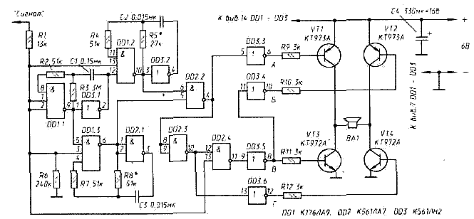 Напряжение питания «сирены» может быть и выше указанного, но не выше допустимого для микросхем (для микросхем серии К561 Uпит max=15 В). В таких случаях транзисторы рекомендуется ставить -на хорошие теплоотводы и использовать динамические головки с Rні8 Ом.