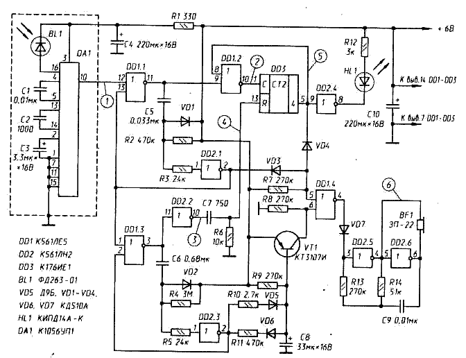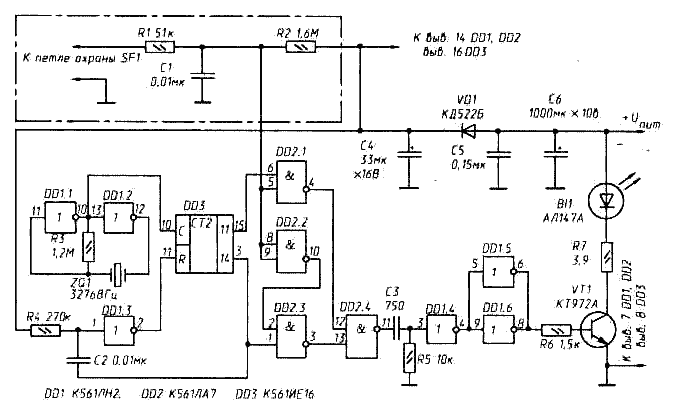 Большие помехи в радиоэфире, легкость обнаружения переданного по радио и последующей его имитации, административно-финансовые препятствия, созданные перед каждым желающим воспользоваться радиоканалом в своей охранной системе (ОС)*, заставляют искать здесь какие-то иные средства связи. С появлением полупроводниковых излучателей, способных генерировать мощные ИК вспышки, и фотодиодов с встроенной оптикой инфракрасный диапазон стал представлять интерес и в этом отношении. В линии связи, работающей в системе охранной сигнализации, должны, очевидно, по-разному представляться три возможные ситуации: а) на охраняемом объекте нарушений нет; б) объект передает сигнал тревоги; в) <обрыв> в канале связи. *) В России передачу сигналов охранных систем по радио разрешено вести лишь в двух частотных каналах (см. с. 10). Это - для всех нас. Напомним, что в особом состоянии ионосферы, на так называемом <проходе>, помеху, блокирующую радиоканал, может вызвать не только сигнал соседа, находящегося <лишь> в 5...10 км, но и радиопередатчик, удаленный на 1.5...2 тысячи километров. Его принципиальная схема приведена на рис. 55. Здесь DD1.1, DD1.2, R3, ZQ1 - тактовый генератор, возбуждающийся на частоте кварцевого резонатора fр=32768 Гц. DD3 - счетчик, на выходе 11 (выв. 15) которого формируется 16-герцовый меандр (f11=fр/2^11), а на выходе 14 (выв. 3) - 2-герцовый (f14=fр/2^14). Элементы DD2.1- DD2.4 образуют переключатель, на выходе которого (выход DD2.4) возникает 2-герцовый или 16-герцовый меандр в зависимости от уровня напряжения на входе 5 элемента DD2.1*. Из фронта меандра дифференцирующая цепочка R5C3 и импульсный усилитель DD1.4-DD1.6 формируют в базе нормально запертого транзистора VT1 импульс тока длительностью tи@10 мкс (tи@R5·C3). Возникающий в цепи коллектора транзистора VT1 ток возбуждает ИК диод BI1 ив пространство излучается короткая ИК вспышка. Итак, ИК передатчик всегда что-то излучает - либо редкие, 2-герцовые импульсы, если оснований для тревоги нет, либо частые, 16-герцовые - тревожные. Рис. 55. Передатчик ИК линии связи
