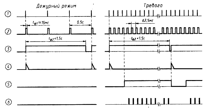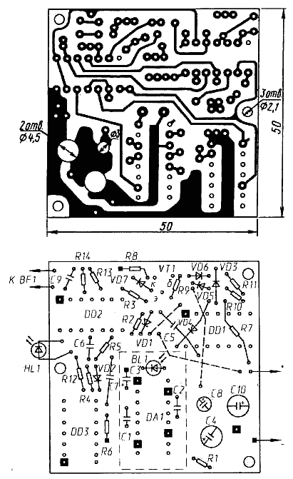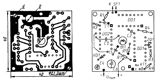 Рис. 61. Приемник ИК линии связи *) Выделенное на рисунке штрих-пунктиром - пример датчика охранной системы, формирующего на своем выходе нужный сигнал. Принципиальная схема приемника в ИК линии связи приведена на рис. 61. Здесь DA1 - усилитель-формирователь, преобразующий ИК вспышку, освещающую фотодиод BL1, в импульс напряжения с амплитудой U10@Uc4 (эпюра 1 на рис. 62). Одновибратор, выполненный на элементах DD1.1, DD2.1 и др., расширяет этот импульс* до tф1@R2·C5@15 мс (эпюра 2 на рис. 62) для задержки его спада (1) на входе С счетчика DD3 и формирования <щелчка> длительностью tф1, в звуковом генераторе, выполненном на DD2.5, DD2.6, BF1 и др. Одновибратор DD1.3, DD2.3 и др. формирует импульс длительностью tф2@R4·C6@1,5 с (эпюра 3 на рис. 62), разрешающий беспрепятственный подсчет импульсов в DD3 лишь на этом временном интервале. Приемник активизируется фронтом первой же ИК вспышки. Из него формируется короткий (tr@R6-C7) импульс на входе R счетчика DD3 (эпюра 4 на рис. 62), устанавливающий счетчик в предстартовое состояние (ему соответствует 0 - напряжение низкого уровня - на всех его выходах), а спадом импульса длительностью tф1 Рис. 62. Эпюры сигналов в счетчик записывается первая единица. Если на фотоприемник поступают импульсы, следующие с частотой 2 Гц (с такой частотой, напомним, следуют ИК вспышки, если датчики на охраняемом объекте не потревожены), то на выходе 4 (выв. 5) счетчика DD3 сохраняется 0, так как фронтом четвертого импульса (он появится через 0,5х4=2 с - по окончании разрешающего счет интервала tф2 =1,5 с) счетчик DD3 будет возвращен в исходное состояние. По иному ведет себя приемник, если на него приходят ИК импульсы, период следования которых равен 62,5 мс, т.е. - сигнал тревоги. Поскольку 62,5х4=250 мс < tф2-1,5 с, то четвертый импульс переведет счетчик DD3 в состояние <4> (000100; на его выводе 5 появляется 1 - напряжение, близкое к напряжению питания), счетчик в этом состоянии самозаблокируется (сигнал 1 на входе 8 элемента DD1.2 делает его нечувствительным к сигналам на входе 9), а включившийся красный светодиод HL1 и 16-герцовые щелчки звукового генератора доведут сигнал тревоги до окружающих (эпюры 5 и 6 на рис. 62). Это будет продолжаться примерно 1,25 с (tф2 -0,25), после чего возникнет 0,25-секундная пауза и тревожная сигнализация повторится. При обрыве связи приемник ведет себя иначе. Если на временном интервале tобр (tобр=R11·C8) приемник не обнаруживает ИК вспышки, конденсатор С8 разряжается по цепи VD6, R11, DD2.3, транзистор VT1 открывается до насыщения, напряжение на резисторе R8 увеличивается с -О В почти до напряжения питания, на выходе DD 1.4 устанавливается напряжение низкого уровня и звуковой генератор начинает излучать монотонный сигнал с частотой fтон@1/2R14·C9. С появлением первой же ИК вспышки конденсатор С8 быстро заряжается по цепи R10, VD5, тональное излучение прекращается и приемник приступает к анализу поступающих сигналов. Печатную плату приемника изготавливают из двустороннего фольгированного стеклотекстолита 50х50 мм толщиной 1,5 мм (рис. 63) подобно тому, как это сделано в ИК передатчике. Фотоголовку ИК приемника (BL1, DA1 и др.), обладающую высокой чувствительностью к электрическим наводкам в широком спектре частот, необходимо экранировать. Экран изготавливают из жести, его выкройка показана на рис. 64. Штриховые линии здесь - места сгибов. Согнутый экран пропаивают в углах, выравнивают его низ и, установив в нужном положении