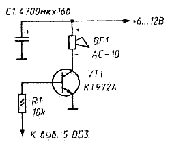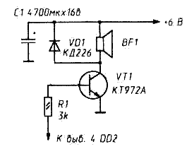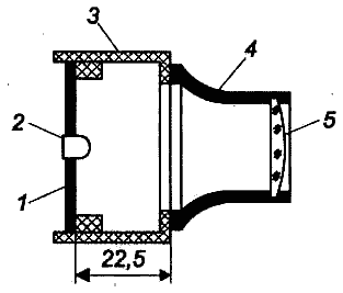 Рис. 65. Конструкция приемника поступающий световой поток на фотодиоде и значительно увеличит чувствительность фотоприемника к слабым сигналам**. К узлу крепления приемника предъявляются те же требования, что и к креплению передатчика: должна быть обеспечена удобная его наводка и надежная фиксация в лучшем положении. Если по условиям связи ИК приемник должен быть вынесен на улицу (для связи, например, с автомобилем, стоящим у торца дома, или с квартирой на другом его конце), то его лучше составить их двух частей: внешней, во влагозащитный корпус-бленду которой помещают лишь объектив и фртоголовку, и внутренней - со всем остальным. Эти части связывают тонким трехпроводным кабелем (<+>, <->, выв. 10 микросхемы DA1). Приемник может быть дополнен акустическим излучателем большей мощности, например, динамической головкой, включенной так, как показано на рис. 66, или пьезосиреной ACT-10 (рис. 67), сохраняющей достаточную мощность и при пониженном напряжении питания. Как показали предварительные испытания, протяженность ИК линии связи с описанными здесь ИК приемником и передатчиком достигает 70 метров. Существенное ее увеличение может дать переход В ИК приемнике важнее диаметр объектива. С его увеличением увеличивается освещенность р-п перехода фотодиода и, соответственно, расстояние, с которого может быть зафиксирована ИК вспышка излучателя.