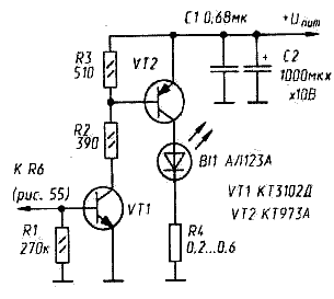 Рис. 58. Узел крепления передатчика проволокой диаметром 2...2,5 мм (рис. 58). Один из пятачков крепят винтами к боковой стенке излучателя (резьба - в стенке), другой - шурупами к опоре. Проволоку сгибают так, чтобы излучатель занял нужное положение. Во избежание значительных вибраций она должна быть возможно более короткой. Испытания показали, что при Uпит=6 В передатчик способен обеспечить связь на расстоянии r@70 метров (с отоприемником, описание которого приведено ниже). Но это не предел. Зависимость r от Iимп при прочих равных условиях имеет вид: г@к·ЦIимп , где к - коэффициент, учитывающий <Прочие условия>. Таким образом, при Uпит =10 В r@100 м. Ток в ИК диоде может быть увеличен и за счет сопротивления резистора R7: Iимп=[Uпит-4] /R7 (Iимп - в амперах, Uпит - в вольтах, R7 - в омах). Но делать это нужно с осторожностью: в любом сочетании Uпит и R7 амплитуда тока в ИК диоде не должна превышать предельно допустимую (см. приложение 3). Значительное увеличение яркости ИК вспышки можно получить, перестроив <сильноточную> часть импульсного усилителя так, как показано на рис. 59 (печатная плата - на рис. 60, а, б). В этом случае может быть достигнут ток в импульсе Iимп=10 А - допустимый для ИК диода типа АЛ123А. Резистор R4 - самодельный, отмеренный по цифровому омметру или вычисленный (см. приложение 8) отрезок нихромовой, константановой или манганиновой проволоки.