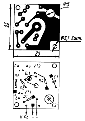 Рис. 56. Печатная плата передатчика На рис. 56 показана печатная плата передатчика, которую изготавливают из двухстороннего фольгированного стеклотекстолита толщиной 1,5 мм. Фольга со стороны деталей используется лишь в качестве нулевого провода-<земли>; в местах пропуска проводников в ней вытравлены фрагменты той или иной конфигурации. Место пайки к нуль-фольге <заземляемого> вывода резистора, конденсатора и др. показано зачерненным квадратом; соединение с ней вывода микросхемы или проволочной перемычки - квадратом со светлой точкой в центре. В центре платы сверлят отверстие под ИК диод, его выводы припаивают к соответствующим уширениям на печатных проводниках внакладку. Все резисторы ИК передатчика - типа МЛТ-0,125. Конденсаторы: С1, С2, С5 - КМ-6 (выводы в одну сторону); С4 - К50-6; С6 - TOWA или другой, диаметром не более 10 мм; СЗ - КМ-5 (выводы в разные стороны). Имеющиеся в продаже ИК диоды предназначены для работы в устройствах дистанционного управления бытовыми радиоаппаратами и обычно имеют довольно широкий - до 30...400 - лепесток излучения. Для увеличения <дальнобойности> такого излучателя в него нужно ввести линзу-конденсор. Так, как показано на рис. 57. Здесь: 1 - печатная плата передатчика; 2 - ИК-диод; 3 - корпус передатчика (ударопрочный полистирол толщиной 2...2,5 мм); 4 - обойма стандартной 5-кратной часовой лупы (на ней должен быть значок <х5>); 5 - ее линза.