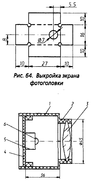 Рис. 63. Печатная плата приемника на нуль-фольгу (на плате оно показано штриховой линией), припаивают к ней в двух-трех точках. Конструктивно ИК приемник может быть выполнен так, как показано на рис. 65. Здесь: 1 - корпус приемника (черный полистирол толщиной 2...2,5 мм); 2 - обойма 7-кратной ручной лупы (ручка срезана); 3 - ее линза; 4 - печатная плата; 5 - экран фотоголовки; 6 - фотодиод ФД 263-01. Обойму лупы приклеивают к передней стенке корпуса, имеющей отверстие диаметром 35 мм (клей - распущенные в растворителе 647 или в RS-2 кусочки полистирола). Расстояние между стоящими соосно фотодиодом и линзой должно быть близко к ее фокусному расстоянию. Это сконцентрирует