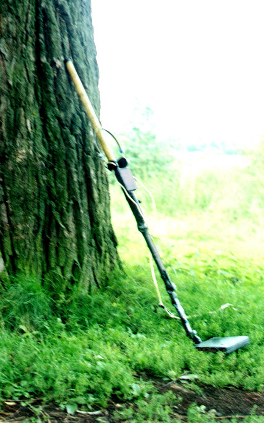 Транзисторы, конденсаторы и резисторы смонтированы на плате (рис.) из изоляционного материала. Плату соединяют с катушками, батареей питания, выключателем и разъемом, многожильным проводом в изоляции. Плату и остальные детали размещают в фанерном клееном футляре размерами 40х200х350 мм. Катушку L1 прикрепляют ко дну футляра, а внутри катушки на расстоянии 5...7 мм от ее витков размещают катушку L2. Рядом с этой катушкой крепят плату. Разъем и выключатель прикрепляют снаружи к боковой стенке футляра. Сверху к футляру крепят (желательно на клею) деревянну ручку примерно метровой длинны.