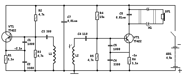 Колебательный контур приемника индуктивно связан с контуром генератора, поэтому в коллекторной цепи транзистора VT2 протекают токи частотой обоих генераторов, а также ток разностной частоты, иначе говоря, частоты биения. Если, к примеру, частота основного генератора 460 кГц, а частота генератора приемника 459 кГц, то разностная составит 1кГц, т. е. 1000Гц. Этот сигнал и слышен в телефонах. Но стоит приблизить поисковую катушку L1 к металлу, как частота звука в телефонах изменится- в зависимости от вида металла она или понизится, или станет выше.