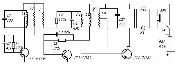 По такойже схеме собран и второй генератор на транзисторе VT2 с примерно равной первому частотой. Катушки связи (L3 и L4) обоих генераторов соеденены последовательно и подключены к выходному каскаду, союранному на транзисторе VT3. В его коллектурную цепь включены (через разъем Х1) головные телефоны BF-1.