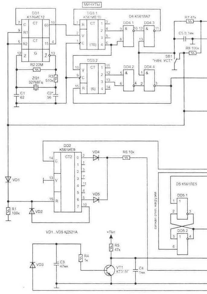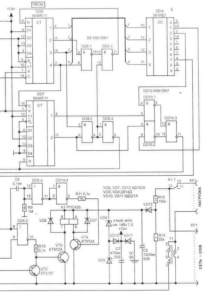 Электрическая схема устройства (рис. 1.46) собрана на КМОП микросхемах и работает в режиме микротоков. Что позволяет использовать бестрансформаторное питание от сети 220 В. Коммутацию питающего телевизор напряжения осуществляют контакты К1.1 поляризованного реле. Оно срабатывает за счет накопленной на конденсаторе С8 энергии при подаче напряжения на соответствующую обмотку. А для фиксации своих переключающих контактов ему не требуется постоянного питания, что позволяет уменьшить потребляемую схемой энергию. Приставка потребляет от сети ток не более 1,4 мА. Для того, чтобы цикл работы схемы не нарушался в случае временного исчезновения сетевого напряжения, использован резервный аккумулятор G1 (7Д-0,125Д), от которого будут питаться только цифровые микросхемы. Работает схема следующим образом. На микросхеме DD1 собран стабилизированный кварцевым резонатором генератор минутных импульсов. С выхода генератора (DD1/10) импульсы приходят на делитель с коэффициентом 60 (DD3, DD4). На вход DD6/15 поступают часовые импульсы. На микросхемах DD6, DD7, DD8 собран делитель с коэффициентом 24 (суточный цикл часов). Счетчики DD6 и DD7 имеют входы D1...D4 для начальной установки числа в двоичном коде. На схеме показаны перемычки на входах для времени 21 ч. В этот момент времени необходимо нажать кнопку начальной установки SB1. Она обеспечивает обнуление счетчиков DD1...DD3 (по входам R), а также запись двоичного кода в регистры начальной установки счетчиков часов DD6, DD7 времени 21-00. Это позволяет упростить электрическую схему за счет отказа от использования индикаторов текущего времени и элементов для его установки. Селектор временных интервалов выполнен на микросхемах: двоично-десятичном дешифраторе DD9 и логических элементах DD10.1...DD10.3. На входы RS-триггера, собранного из элементов DD5.1-DD5.2, поступают импульсы лог. "1" (на DD5/1 - включение; DD5/6 - отключение нагрузки). При появлении лог. "1" на выходе DD5/4 -дифференцирующая цепь из C6-R9 формирует короткий импульс, который передается через логические элементы DD5.4-DD10.4 и транзистор VT4 для срабатывания обмотки А-Б реле К1 (контакты 12-13 замкнутся). Отключение нагрузки выполняет обмотка В-Г, когда открывается транзистор VT3. Счетчик на микросхеме D2 имеет коэффициент деления 7, что соответствует числу дней в неделе и совместно с транзистором VT2 дает запрет работы VT3 в течении двух выходных дней (когда лог. "1" появляется на выходах DD2/2 или DD2/5, транзистор VT2 открывается и закорачивает управляющий сигнал на базе VT3). При этом предполагается, что первоначальное включение устройства в работу выполняется в воскресенье (в 21-00 кнопкой установки SB1). Для того чтобы схема различала, включен ли телевизор в работу или находится в дежурном режиме, используется датчик тока в цепи нагрузки - токовый трансформатор Т1. При переходе телевизора из дежурного режима в рабочий напряжение во вторичной обмотке Т1 будет достаточным для открывания транзистора VT1. Этот транзистор обеспечивает лог. "0" на входе DD5/9. И если момент включения телевизора совпадет с запрещенным интервалом (лог. "0" на DD5/4), цепь сетевого питания телевизора отключится до момента, пока этот интервал не кончится. В устройстве применены детали: резисторы типа МЛТ или аналогичные (их мощность указана на схеме); полярные конденсаторы С-, С7, С8 типа К50-24, остальные из серии К10, например типа К10-17. Диоды VD1...VD5, VD10, VD11 могут 