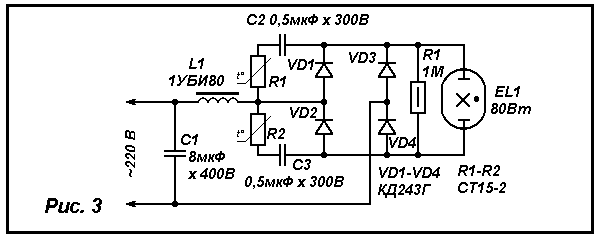 Вот, к примеру, устройство, рассчитанное на питание лампы мощностью до 40 Вт (рис. 2). Работает оно так. Сетевое напряжение подается через дроссель L1 на мостовой выпрямитель VD3. В один из полупериодов сетевого напряжения конденсатор С2 заряжается через стабилитрон VD1, а конденсатор СЗ - через стабилитрон VD2. В течение следующего полупериода напряжение сети суммируется с напряжением на этих конденсаторах, в результате чего лампа ЕL1 зажигается. После этого указанные конденсаторы быстро разряжаются через стабилитроны и диоды моста и в дальнейшем не оказывают влияния на работу устройства, поскольку не в состоянии заряжаться - ведь амплитудное напряжение сети меньше суммарного напряжения стабилизации стабилитронов и падения напряжения на лампе.