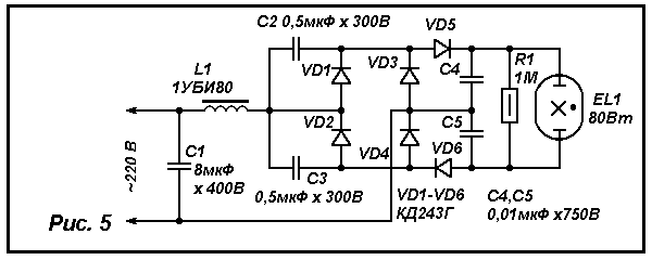 Несколько лучший вариант питания мощной люминесцентной лампы - использовать устройство с учетверением выпрямленного напряжения, схема которого приведена на рис. 5. Некоторым усовершенствованием устройства, повышающим надежность его работы, можно считать добавление терморезистора, подключенного параллельно входу диодного моста (между точками 1, 2 узла У1). Он обеспечит более плавное увеличение напряжения на деталях выпрямителя-умножителя, а также демпфирование колебательного процесса в системе, содержащей реактивные элементы (дроссель и конденсаторы), а значит, снижение помех, проникающих в сеть.