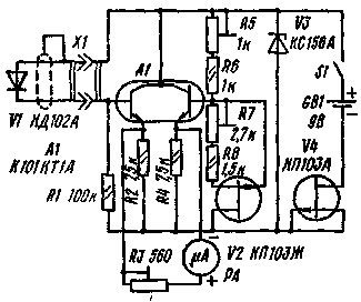 ри изменении температуры возникает напряжение разбаланса, которое регистрируется стрелочным прибором РА. Стрелочный индикатор в термометре - М265М. Прибор калибруют по двум температурным замерам. Первый (0╟С - температура тающего снега) соответствует нулевой отметке шкалы. Термозонд с диодом VI погружают в тающий снег и резистором R5 путем балансировки микросхемы устанавливают стрелку индикатора на нуль. Второй температурный замер, например 50╟С, выполняют в подогретой воде при контроле ее температуры калибровочным термометром. При этом положение стрелки индикатора устанавливают подстройкой резистора R3. При измерении отрицательной температуры следует изменить полярность включения индикатора Р1. Резистором R7 создают режим термостабилизации полевого транзистора V2, при котором ток стока не зависит от температуры окружающей среды. В отличие от биполярных транзисторов, у которых с ростом температуры возрастает ток коллектора, ток стока полевых транзисторов в зависимости от напряжения на затворе при изменении температуры может увеличиваться, уменьшаться или оставаться неизменным. Для отыскания термостабильного режима полевого транзистора необходимо экспериментально измерить стоко-затворные характеристики при различной температуре. Для этого строят графическую зависимость тока стока от напряжения на затворе (по отношению к истоку) вначале при комнатной температуре, затем при повышенной, нагревая транзистор на несколько десятков градусов осветительной лампой. Затем определяют напряжение на затворе, при котором стоко-затворные характеристики, снятые для различных, температур, на графиках пересекаются. Точка пересечения характеристик называется термостабильной. Вместо напряжения на затворе можно определить положение движка потенциометра R7, при котором стоко-затворные характеристики транзистора не зависят от температуры.
