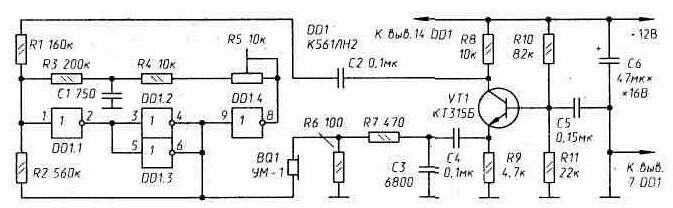 Возможны и другие конструктивные варианты, когда в общем блоке используются выносные излучатель BQ1 и микрофон ВМ1. В таком исполнении провода, соединяющие излучатель и микрофон с общим блоком, должны быть экранированными и как можно более короткими.