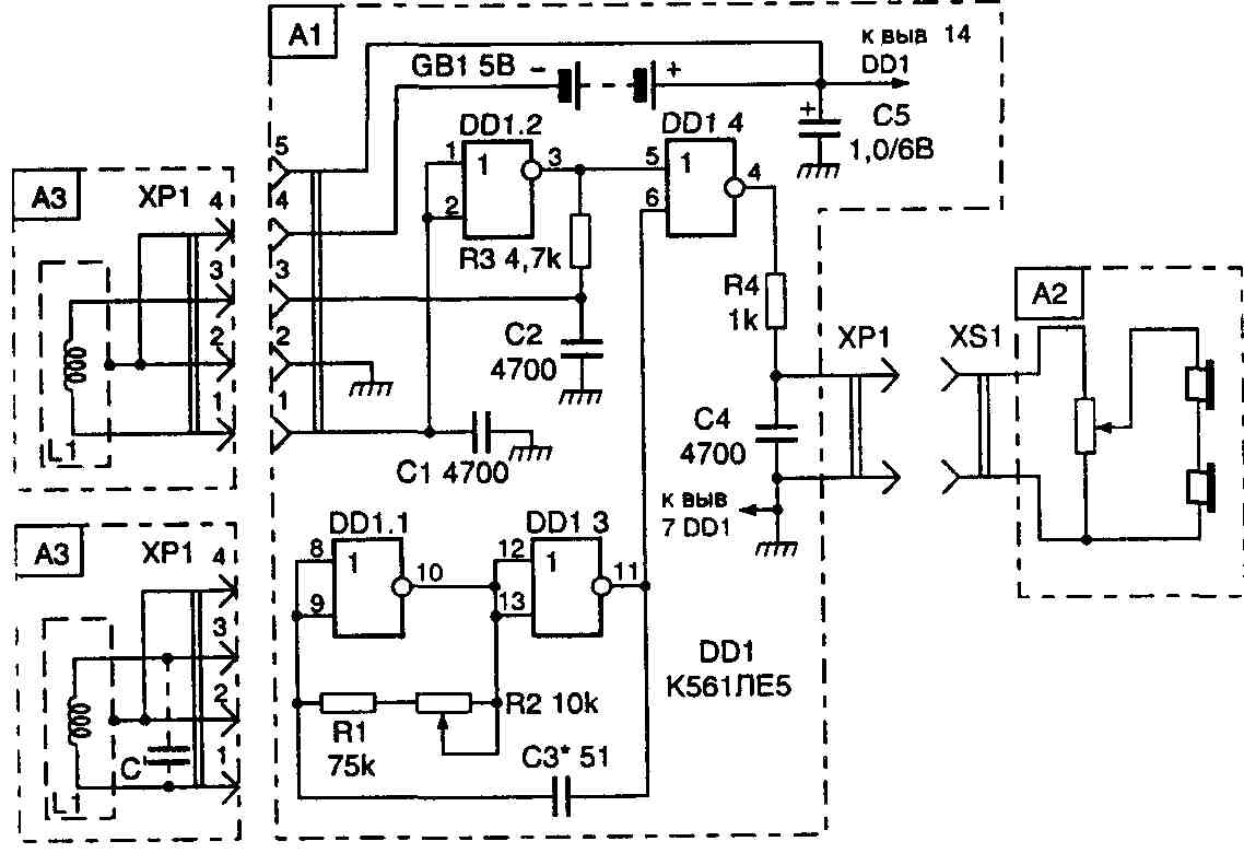 DD1.2 и одной из выносных катушек индуктивности, подключаемых к генератору через разъем XS1. Сигналы обоих генераторов поступают на смеситель, собранный на элементе DD1.4. К выходу смесителя через фильтр R4C4, ослабляющий высшие частоты, подключены головные телефоны (узел А2). Для получения большей громкости звука капсюли телефонов соединены последовательно.