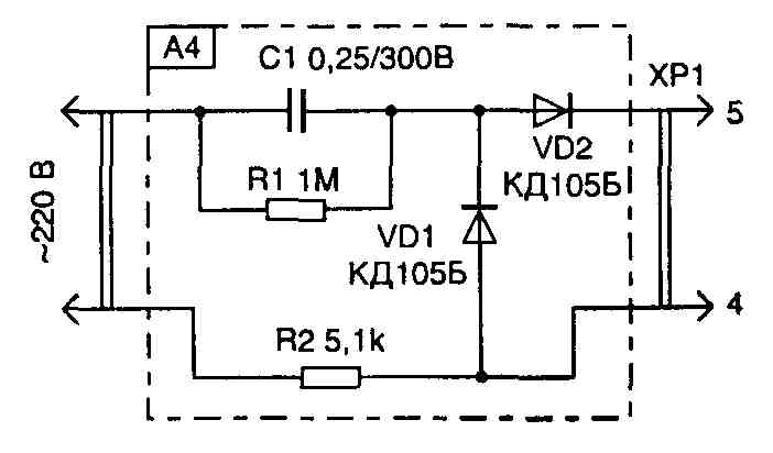 Источник питания, батарею GB1, составляют из четырех последовательно соединенных аккумуляторов Д-0,1 или Д-0,06. Поскольку аккумуляторы со временем истощаются, для подзарядки батареи используют простое зарядное устройство (узел А4 на рис. 4.16), включаемое в разъем XS1 с помощью пятиштырьковой вилки.
