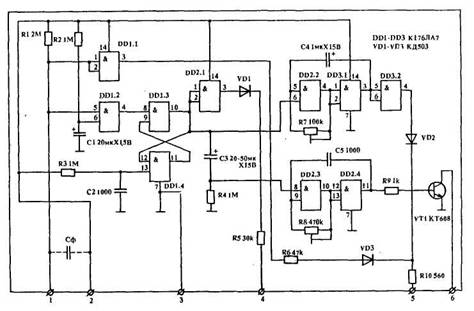 Звуковой сигнал ограничен по времени 1 ≈ 2 мин. Его длительность определяет емкость СЗ. Совместно с устройством возможно применение любых датчиков, работающих на размыкание. При значительной длине охранного шлейфа в устройстве устанавливается Сф емкостью от 1000 до 10000 пФ. После включения устройство через 30 ≈ 40 сек. переходит в режим охраны, при этом заметно неяркое свечение сигнализатора. При кратковременном нарушении целостности шлейфа система переходит в режим подачи тревожного сигнала. Частота вспышек устанавливается R7, тональность звукового сигнала ≈ R8. Источник питания (9 ≈ 12В) подключается к клеммам 2(+) и З(-). Охранный шлейф ≈ к клеммам 1 и 2. Световой сигнализатор (АЛ307БМ) ≈ к клеммам 5 <+) и 3 (-). Звуковой излучатель (R10 Ом) ≈ к клеммам 2 и 6. Выход на пульт наблюдения ≈ к клеммам 4 (+) и 3 (-).