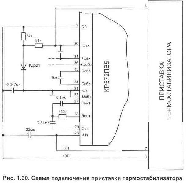 Нередко в быту требуется поддерживать заданную температуру в ограниченном объеме пространства. Это может быть аквариум, хранилище продуктов, инкубатор, сушильный шкаф или подогреватель детского питания. Удобно, если при работе такого устройства будет еще и цифровая индикация фактической температуры. Вашему вниманию предлагается два варианта выполнения автоматических устройств для поддержания заданной температуры. Термостабилизатор с использованием микросхемы КР572ПВ5В литературе [Л10, Л11] опубликованы простые схемы цифровых измерителей температуры, выполненные на основе микросхемы аналого-цифрового преобразователя (АЦП) КР572ПВ5 и цифровом жидкокристаллическом индикаторе ИЖЦ5-4/8. Эта микросхема изготовлена по МОП технологии и все устройство вместе с индикатором от источника питания (9 В) потребляет ток не более 2 мА. Такой измеритель температуры не сложно превратить в термостабилизатор. Для этого потребуется подключить к указанным выше устройствам схему управления нагревательным элементом, как это показано на рис. 1.30. Методика изготовления и настройки непосредственно измерителя температуры подробно приводится в указанной выше литературе и поэтому здесь описываться не будет. Рассмотрим более подробно только электрическую схему приставки термостабилизатора (рис. 1.31). Ее принцип работы основан на том, что порог переключения исполнительного устройства (электронного коммутатора напряжения в нагрузке) устанавливается по показаниям цифрового индикатора, имеющегося в измерителе температуры. Фактически микросхема (КР572ПВ5) является цифровым вольтметром, который измеряет напряжение, поступающее с термо-