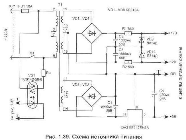 Необходимая температура задается при помощи переключателей SA1 и SA2. Схема совпадения на элементах DD12, DD13 обеспечивает отключение нагревателей, как только код с выходов дешифраторов достигнет или превысит значения, установленные переключателями. Использование в качестве силового коммутатора оптоэлектронного симистора позволяет обеспечить хорошую развязку схемы управления от сети. В процессе выхода термокамеры на заданный режим из-за инерционности системы температура в камере может меняться, как это показано на рис. 1.38. В установившемся режиме точность поддержания температуры будет не хуже 0,5°С. Схема также предусматривает дистанционное управление выключением нагревателя (уровнем лог. "0") от внешнего времязадающего таймера, подключаемого через разъем Х1 (от него же таймер может и питаться). Источник питания для схемы термостабилизатора показан на рис. 1.39. Питающие напряжения на выводы логических микросхем подаются в соответствии с табл. 1.2. В устройстве установлены подстроечные резисторы типа СП--19а, постоянные резисторы С2-23. В качестве датчика темпера-