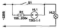 Для выполнения подсветки используется неоновая лампочка типа ТЛ, включенная последовательно с резистором 150...200 кОм в разрыв контактов включателя (рис. 7.15). Неоновый индикатор будет светиться, только когда освещение не включено.