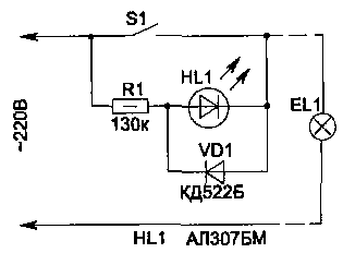 Существует и второй путь, позволяющий сделать видимым ночью место расположения включателя. На рис. 7.16 приведена схема для включения индикаторного светодиода. Но при этом потребуется выполнить отверстие в корпусе включателя для закрепления светодиода. Да и элементов она содержит больше.