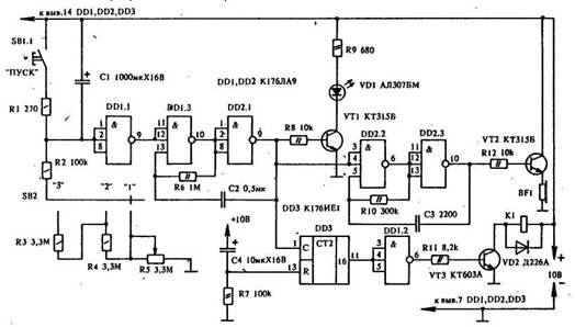 Всего три микросхемы и несколько других элементов потребуется для сборки простого реле времени, которое можно применить для отключения от сети различных бытовых устройств. Длительность выдержки реле времени составляет от 3 до 120 минут. Ее можно устанавливать переключателем SB2 (грубо) и переменным резистором R5 (точно). Схема устройства состоит из собственно реле времени (DD1.1); генератора тактовых импульсов (DD1.3, DD2.1), вырабатывающего импульсы с частотой 1 Гц; генератора звуковой частоты (DD2.2, DD2.3) и счетчика (DD3). Для запуска реле времени необходимо нажать кнопку SB 1.1, которая спарена с сетевым выключателем, ≈ тем самым разряжается конденсатор С1. После отпускания кнопки реле времени начнет работать. Конденсатор С1 зарядится через резистор R2 или цепочку R3 ≈ R5 (это зависит от положения переключателя SB2). Как только напряжение, на входах DD1.1 достигнет порога переключения, на выходе .элемента появится уровень логической "1" и запустится генератор на элементах DD1.3, DD2.1. На выходе DD2.1 будут следовать импульсы с тактовой частотой 1 Гц. Ключ на транзисторе VT1 необходим для управления светодиодом VD1, который будет мигать с этой же частотой. Импульсы частотой 1 Гц управляют также генератором звуковой частоты. Усилитель на транзисторе VT2 необходим для согласования выхода DD2.3 с телефонным капсюлем BF. Генератор вырабатывает импульсы частотой около 1 кГц. Для задержки отключения, о котором предупреждают VD1 и BF, служит счетчик DD3. Тактовые импульсы поступают на его вход С. Конденсатор С4 и резистор R7 необходимы для установки счетчика в нулевое состояние. После поступления пятнадцатого импульса на выходе счетчика появится логическая "1" и через инвертор DD1.2 закроет VT3, отключив тем самым реле К1, а оно, в свою очередь, отключит нагрузку и питание реле времени. При необходимости продлить время задержки отключения выходы DD1.2 можно присоединить к выводу 12 счетчика DD3. В этом случае задержка составит 31 импульс, то есть 31 сек. В режиме "1" выдержка составляет от 3 до 40 минут, в режиме "2" ≈ 40 ≈ 80 минут и в режиме "3" ≈ 80 ≈ 120 минут. В реле времени используются резисторы МЛТ-0,125, МЛТ-0,25, конденсаторы К50-35, МБМ или КМ. Транзисторы VT1 и VT2 ≈ любые из серии КТ315, VT3 ≈ КТ602, КТ815. Микросхемы можно заменить на К561ЛА9, DD3 ≈ на другой подобный счетчик, но при этом придется изменить чертеж печатной платы. Телефонный капсюль BF ≈ любой с сопротивлением обмотки 100 - 1000 Ом. Переключатели SB1 ≈ типа П2К без фиксации, SB2 ≈ П2К на 3 группы переключения.