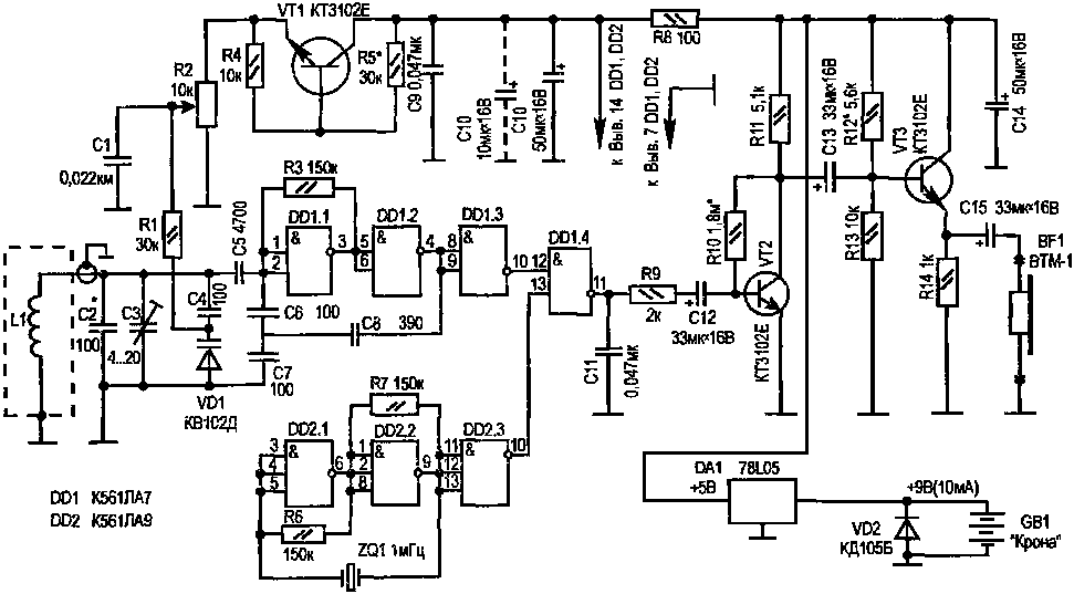 Перестраиваемый генератор собран по так называемой схеме «емкостной трехточки» на логических элементах DD1.1 — DD1.2 отечественной ИМС К561ЛА7. Его колебательный контур образован поисковой катушкой L1, конденсаторами С2 — С4 и варикапом VD1, подача требуемого напряжения на который обеспечена наличием потенциометра R2, выполняющего функцию органа настройки на низкую частоту биений.