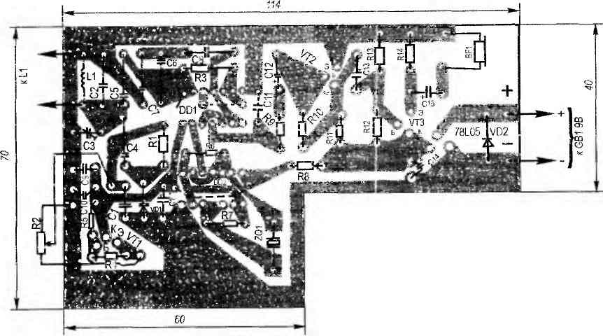 Более жесткие требования у С2, С4 — С8: для большей надежности и долговечности их работы в разных условиях эти конденсаторы желательно выбирать из числа термостабильных. В частности, выполняющий роль «подстроечника» конденсатор СЗ предпочтительно установить керамический, как наиболее устойчивый к значительным резким перепадам температур (например, типа КТ4-23 емкостью 4...20 пФ). А в качестве болыиеемкост-ных С10.С12 — С15 можно смело использовать «электролиты» К50-6, гарантирующие стабильную работу схемы.