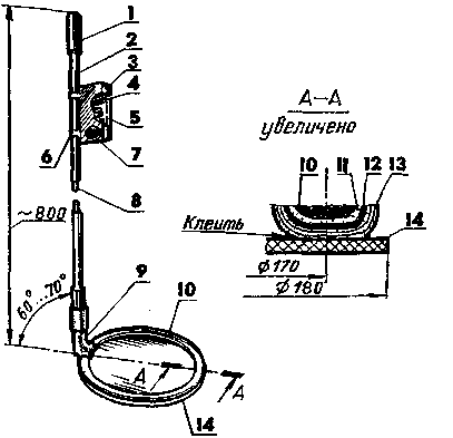 Конструкция самодельного металлоискателя и ее воплощение в реальность: 1 — ручка; 2 — несущая штанга (стеклопластиковая лыжная палка, L900— 1000); 3 — металлический кожух электронного блока; 4— гальваническая батарея «Крона»; 5 — печатная плата со смонтированными на ней радиодеталями; 6— скоба крепления кожуха (2 шт.); 7—регулятор «Настройка»; 8 — коаксиальный кабель; 9 — кронштейн; 10—поисковая катушка (0160 min, 60 витков ПЭЛ-0,2); 11 — изолирующая обмотка (изолента, слой); 12—электростатический экран (разреженная обвивка серпантином из алюминиевой фольги, концы разомкнуты); 13 — защитная обмотка (изолента, 2—3 слоя); 14— основание (круг из стеклотекстолита, s2—4)