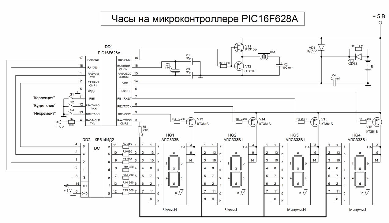 -При нажатии кнопки "Будильник" часы переходят в режим отображения уставки будильника. В этом режиме кнопкой "Инкремент" включаем будильник. Включение подтверждается коротким звуковым сигналом и включается мигающая точка. Корректируется уставка будильника после нажатия кнопки "Коррекция". После первого нажатия - минуты, после второго - часы (увеличиваются кнопкой "Инкремент"). После третьего нажатия - переход в обычный режим.