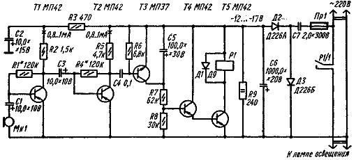 Транзисторы Т1 и Т2 образуют усилитель НЧ, на вход которого подаются сигналы от микрофона. Транзисторы Т4 и Т5 входят в состав реле времени, на выходе которого установлено электромагнитное реле Р1. При громких звуках открывается транзистор ТЗ, разряжая конденсатор С5. Во время разряда этого конденсатора срабатывает реле Р1 и своими контактами Р1/1 включает нагрузку. В отсутствие сигнала транзистор ТЗ закрыт, конденсатор С5 заряжается, обмотка Р1 обесточивается, и контактами Р1/1 разрывается цепь питания нагрузки. Реле Р1 - РЭС-10 (РС4.524.302) или РСМ-1 (Ю.171.81.01).