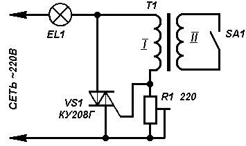 оммутировать переменное напряжение, не применяя выпрямительные диоды, необходимые для тиристорных устройств. Управляют работой симистора выключателем SA1 через маломощный трансформатор T1. При этом используется свойство симистора открываться при подаче на его управляющий электрод напряжения той же полярности, что и на аноде. Вот почему обмотка I трансформатора включена между анодом и управляющим электродом.Если контакты выключателя разомкнуты, через обмотку I протекает небольшой ток холостого хода. Напряжения на резисторе R1 недостаточно для открывания симистора, нагрузка - осветительная лампа EL1 - обесточена.Когда контакты выключателя замыкают, обмотка II оказывается в режиме короткого замыкания. При этом ток в обмотке I резко возрастает, а значит, увеличивается падение напряжения на резисторе. Симистор будет открываться в начале каждого полупериода сетевого напряжения, нагрузка окажется под током. Трансформатор в таком режиме перегружаться не будет, поскольку после открывания симистора напряжение на нем уменьшается до 2 В и в обмотке II протекает незначительный ток.В устройстве желательно применить трансформатор с напряжением на вторичной обмотке 8...10 В при протекании через первичную тока 0,2...0,4 А. Ток холостого хода не должен превышать 10 мА. Подобный трансформатор можно позаимствовать из сетевого адаптера, применяемого для питания плейеров, микрокалькуляторов, транзисторных радиоприемников. Предпочтительнее использовать трансформатор с обмотками, намотанными в разных секциях каркаса, - это повысит электробезопасность устройства. Симистор может быть, кроме указанного на схеме, КУ208В. Если мощность нагрузки не превышает 250 Вт, теплоотвод не понадобится, при большей мощности симистор придется установить на теплоотвод. Максимальная мощность нагрузки не должна превышать 1,1 кВт. Подстроечный резистор - СПО, СП4 или другой. Им устанавливают режим надежного открывания симистора.Симистор, трансформатор и резистор допустимо располагать на удалении нескольких метров от помещения, в котором установлены выключатель и нагрузка (например, осветительные лампы). Для удобства управления нагрузкой можно подключить параллельно вторичной обмотке трансформатора несколько выключателей.