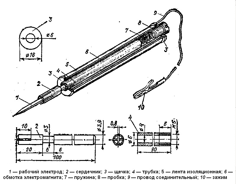 В трубку вставляют сердечник и легкими ударами молоточка завальцовывают ее торец в проточку сердечника. После этого на трубку надевают и паяют латунные щечки. Возле передней (по рисунку) щечки к трубке паяют конец провода катушки (ПЭЛШО 0,5-0,6) и наматывают провод виток к витку по всей поверхности трубки в 6 — 8 слоев. Второй вывод катушки делают многожильным монтажным проводом (например, марки МГШВ) сечением не менее 1 мм2, к концу которого припаивают зажим типа «крокодил». От случайных повреждений обмотку защищают слоем лакоткани, поверх которого ровно наматывают полихлорвиниловую изоляционную ленту. После этого в трубку вставляют пружину (15 — 20 витков) ввинчивают пробку (винт М5), а в разрезной конец сердечника плотно вставляют электрод — стальную иглу диаметром 1 мм.