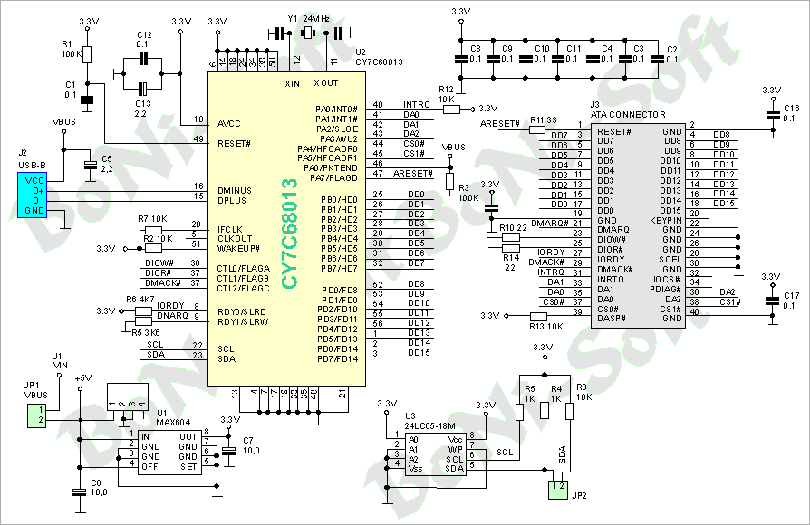 ПК подключается к разъему J2, а внешний «винчестер» - к J3. Управляющий код загружается при инициализации устройства через шину I2C из EEPROM U3. Программное обеспечение и прошивки доступны по адресу http://www.cypress.com/cfuploads/support/developer_kits/ez_usb-devtools.zip |