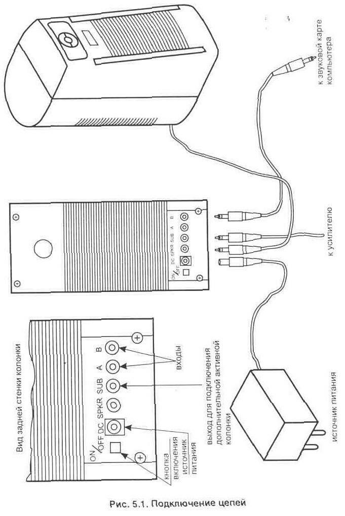 В высококачественных активных колонках, например фирмы Altec Lansing, у встроенного звукового усилителя имеется выход с маркировкой "SUB" (для модели ACS40, рис. 5.1). Он предназначен для подключения низкочастотной активной колонки. Такая колонка может иметь любые габариты (обычно она больше боковых) и располагается по центру на попу, например под столом.