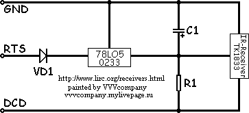 IR-Receiver TK1833 выпуклостью к себе, слева-направо: DCD (сигнал), GND (общий), RTS (питание +)